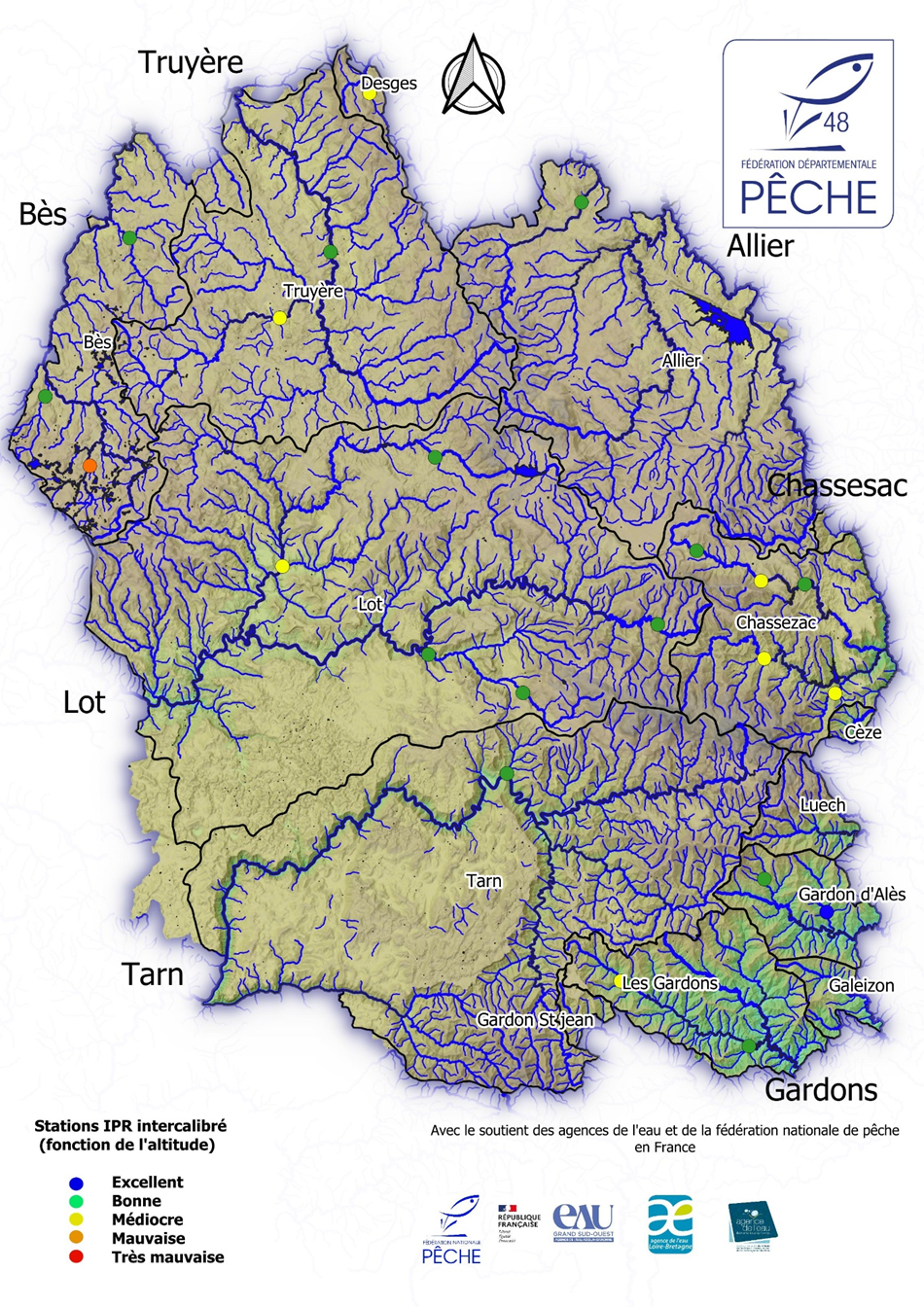 La carte suivante rassemble tous les résultats. Le bilan est mitigé avec une station de qualité excellente, 14 stations avec un indice jugé « bon », 7 stations avec un indice jugé « moyen » et une jugée « médiocre ». Malgré les impacts des années précédentes, les indices se sont bien maintenus (tout poisson confondu).